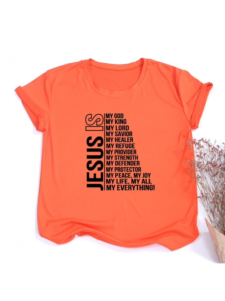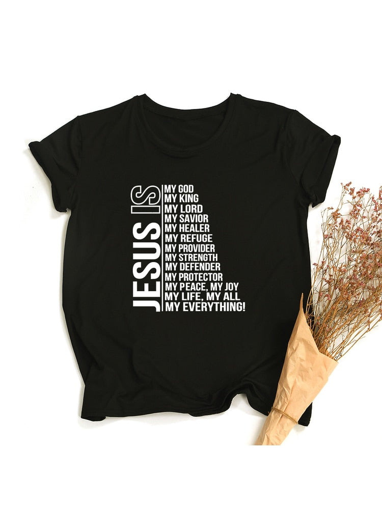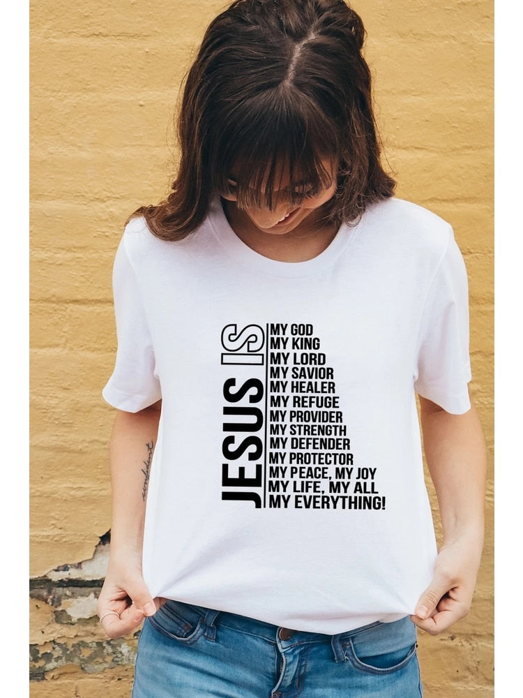Celebrate your Christian faith with our Jesus Is... T-Shirt for women - a powerful and meaningful expression of devotion. Crafted with care, this tee features a simple yet impactful design that showcases the profound message of Jesus as the central figure in your beliefs.